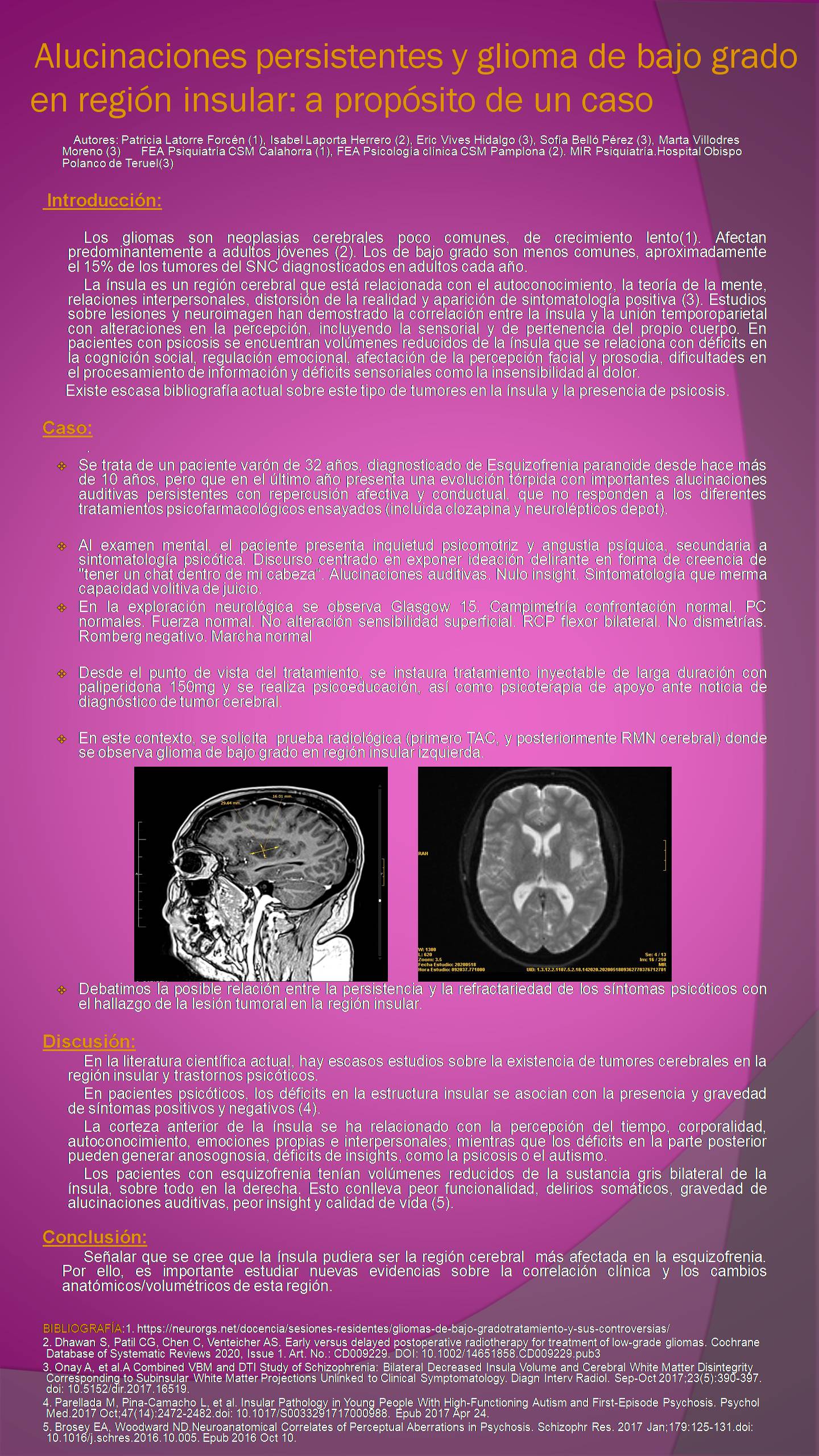 Caso clínico: se trata de un paciente varón de 32 años, diagnosticado de Esquizofrenia paranoide desde hace más de 10 años, pero que en el último año presenta una evolución tórpida con importantes alucinaciones auditivas persistentes con repercusión afectiva y conductual, que no responden a los diferentes tratamientos psicofarmacológicos ensayados (incluida clozapina y neurolépticos depot). En este contexto, se solicita prueba radiológica (primero TAC, y posteriormente RMN cerebral) donde se observa glioma de bajo grado en región insular izquierda. Debatimos la posible relación entre la persistencia y la refractariedad de los síntomas psicóticos con el hallazgo de la lesión tumoral en la región insular.